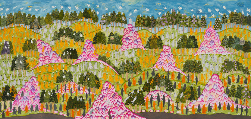 What follows is a text collaboratively composed by Nemesis, GPT-3, K Allado-McDowell and our survey respondents, but arguably authored by none of us, per se. Instead you could say this report was written by the “third mind” of DOOM! which spontaneously arose when we began to process this information together with the conscious goal of generating predictions about the future. The outputs of our GPT-3 experiments have been trimmed, edited for grammar, minorly tweaked and ordered into numbered chapters. All text in yellow is GPT-3’s output. Emphasis in bold is by us. Paintings by Leidy Churchman.